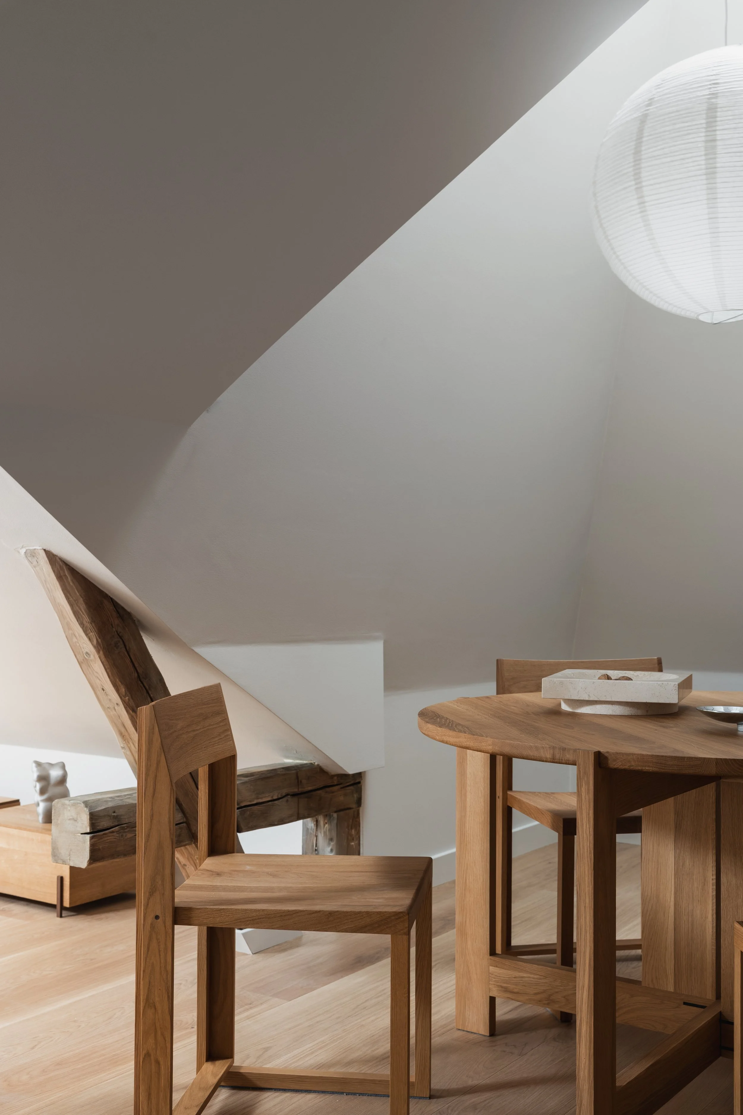 Completed 2026. Curated spatial design for Ansnes Eiendom spring 2026. ----------------------------Set atop a distinguished late-19th-century building in one of Frogner’s most desirable addresses, this penthouse loft apartment offers a rare combination of architectural character and contemporary living. Positioned on the upper floor of an elegant building dating back to 1896, the residence enjoys a privileged sense of light, privacy, and outlook, crowned by a generous private rooftop terrace.Materiality & Architectural ExpressionThe interior design celebrates the apartment’s inherent architectural qualities, where exposed beams, sculptural roof angles, and natural timber elements are thoughtfully integrated into the spatial composition. The material palette emphasizes craftsmanship, warmth, and tactile richness, highlighting the building’s historic structure while introducing contemporary precision. The overall aesthetic is curated in a Scandinavian Mid-Century Modern spirit, combining carefully selected vintage pieces with newly produced furniture to create a balanced and timeless interior character.